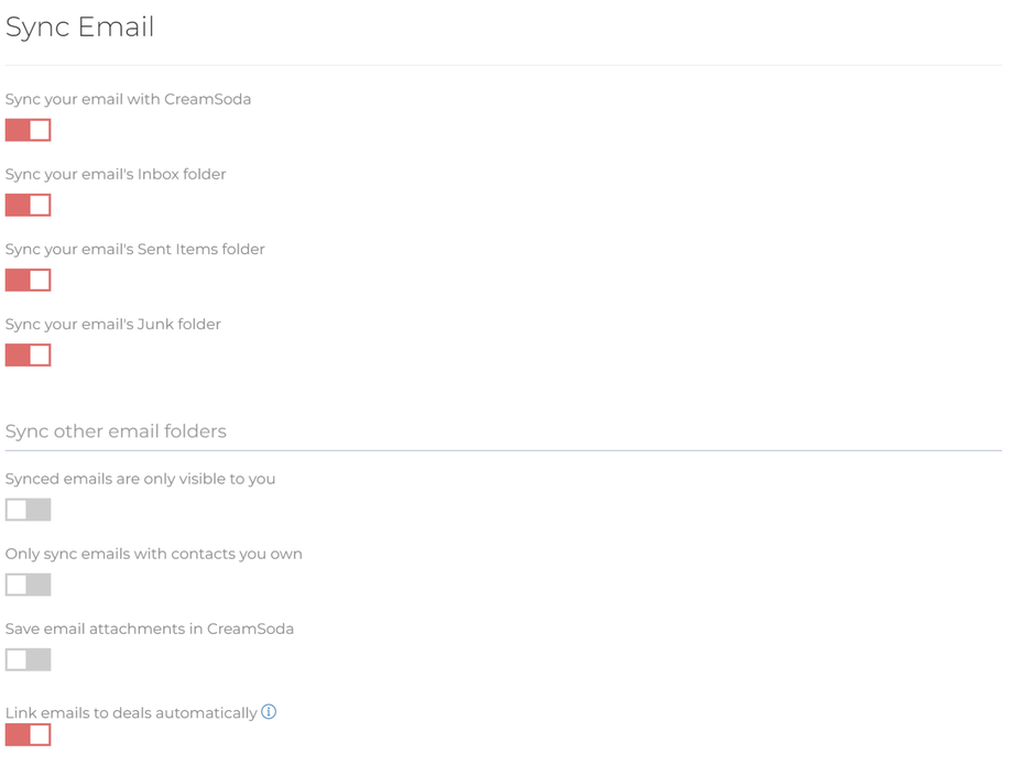 If you want CreamSoda to only save emails from contacts assigned to you, turn on the "Only sync emails with contacts you own" feature. This means CreamSoda will not sync emails from contacts you don't own.