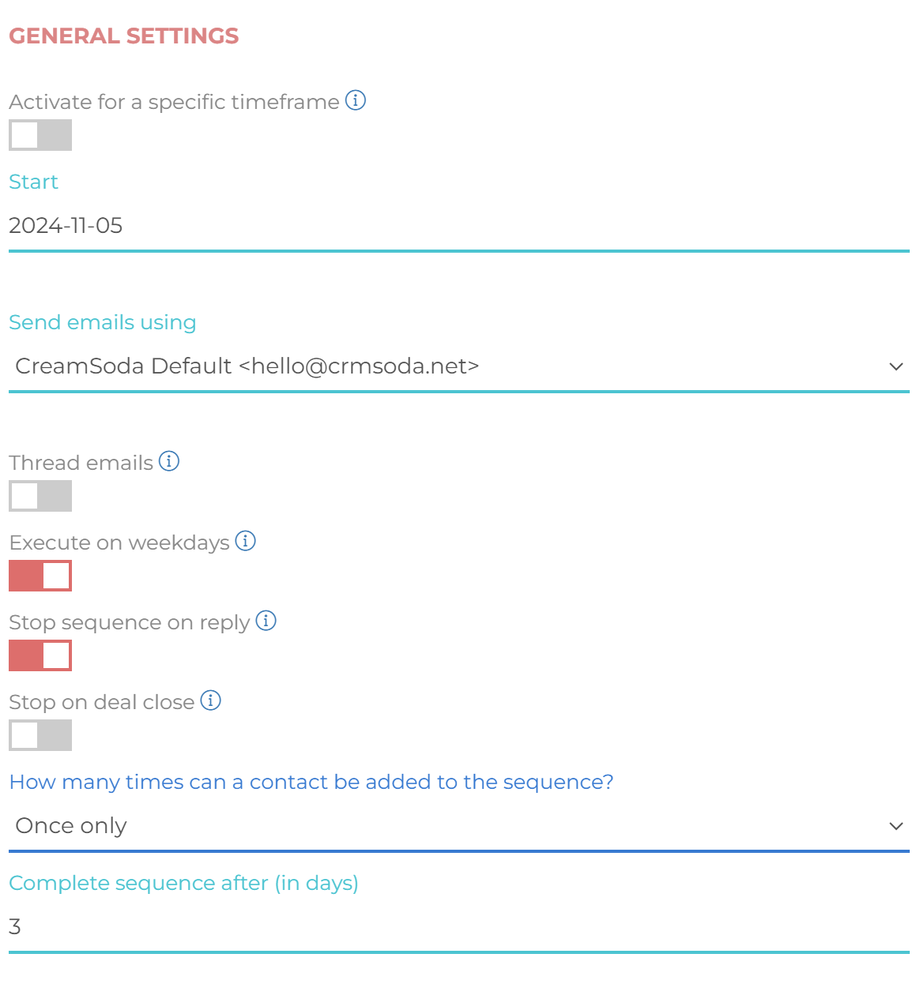 Specific Timeframe Activation: Use the Activate for a specific timeframe toggle to control when the sequence runs. If this option is off, the sequence will start based on the specified Start Date. For immediate activation, you can set the Start Date in the past.