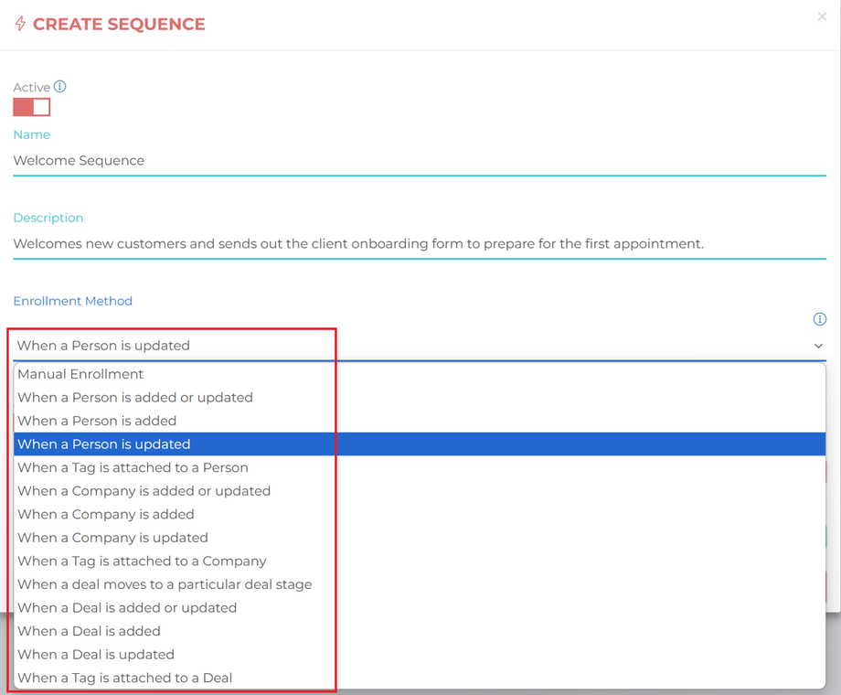 Choose from a list of enrollment methods, such as when a person is added or updated or when a deal moves to a new stage, to tell CreamSoda the trigger point to enroll a contact into your sequence.