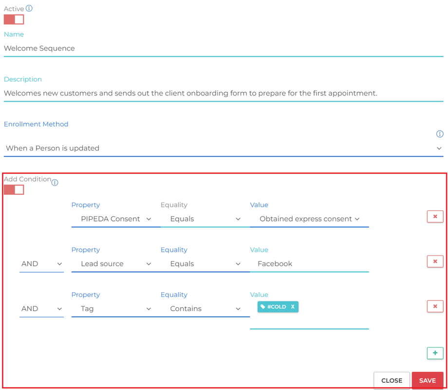 When a sequence begins, certain tags can be automatically added to or removed from the enrolled contact to help with organization and tracking: