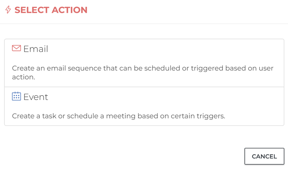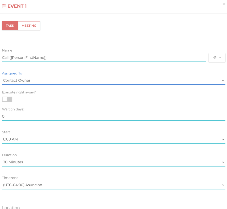 With the Event action, you have the ability to automatically schedule tasks for yourself or a team member or book a meeting with individuals.